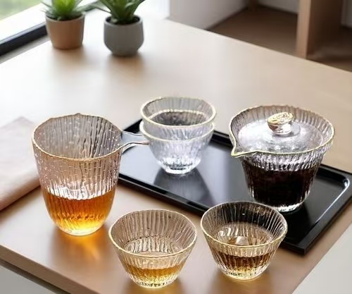 玻璃是一种有色、半透明且不透气的矿物质,具有非常强的可塑性。 玻璃茶具无可替代的特点就是透明。透过玻璃,可以观赏到茶汤的颜色、茶叶的形态,不管是玻璃壶、玻璃公道杯、玻璃茶杯,观赏性都很强。 然而,玻璃茶杯质地脆、容易破碎,且传热迅速,保温性差,茶的香气也易于散失,因此使用玻璃器具冲泡出的茶最好尽快饮用完。